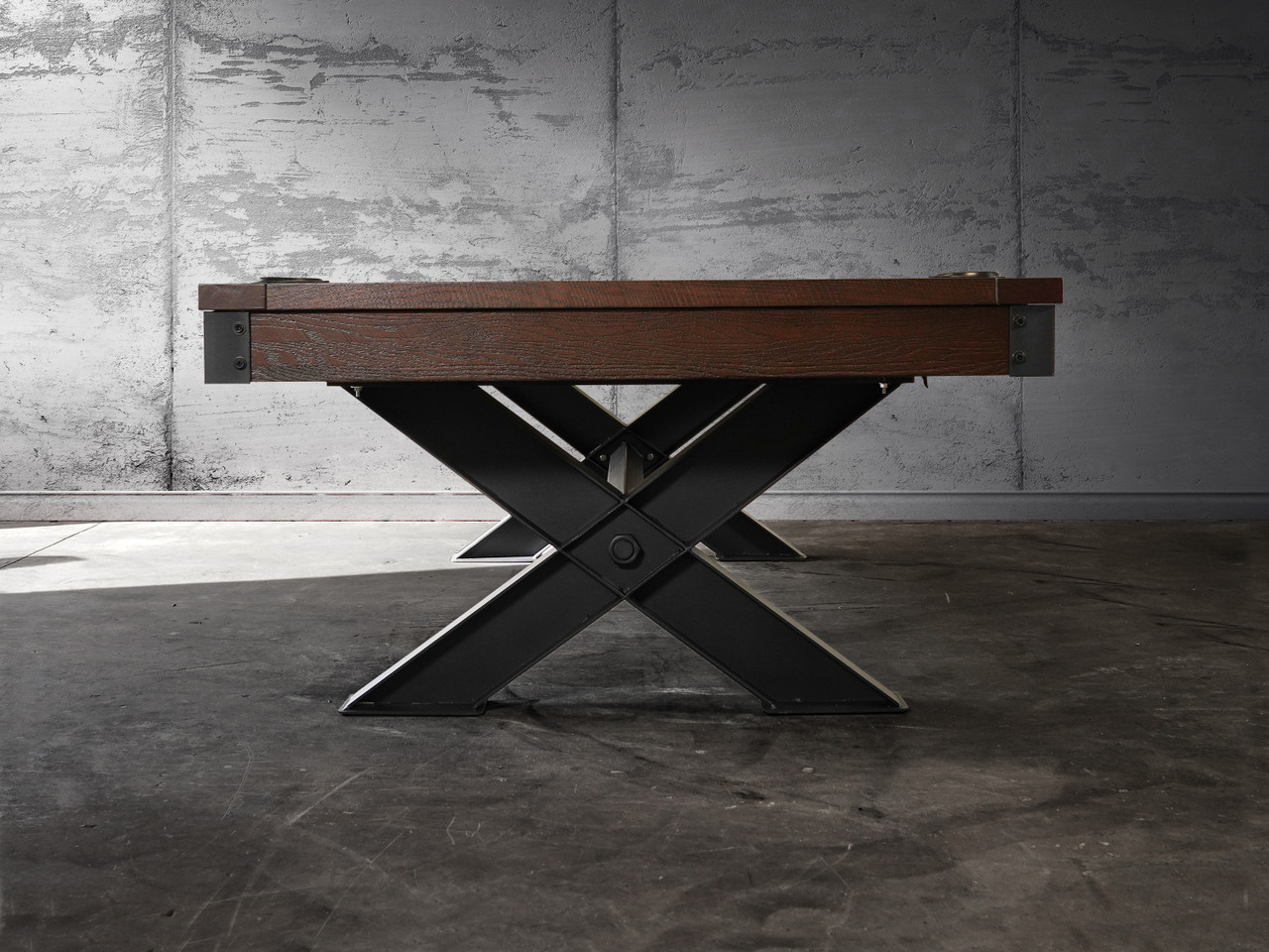 The Portland Slate Pool Table by Nixon Billiards combines modern architectural design with rustic warmth. Featuring a solid hardwood cradle in a rich, natural finish and bold industrial X-style legs in matte black steel, this 8' pool table delivers serious presence in any game room, loft, or entertainment space. It's more than a game table—it's a design-forward centerpiece built for real play.