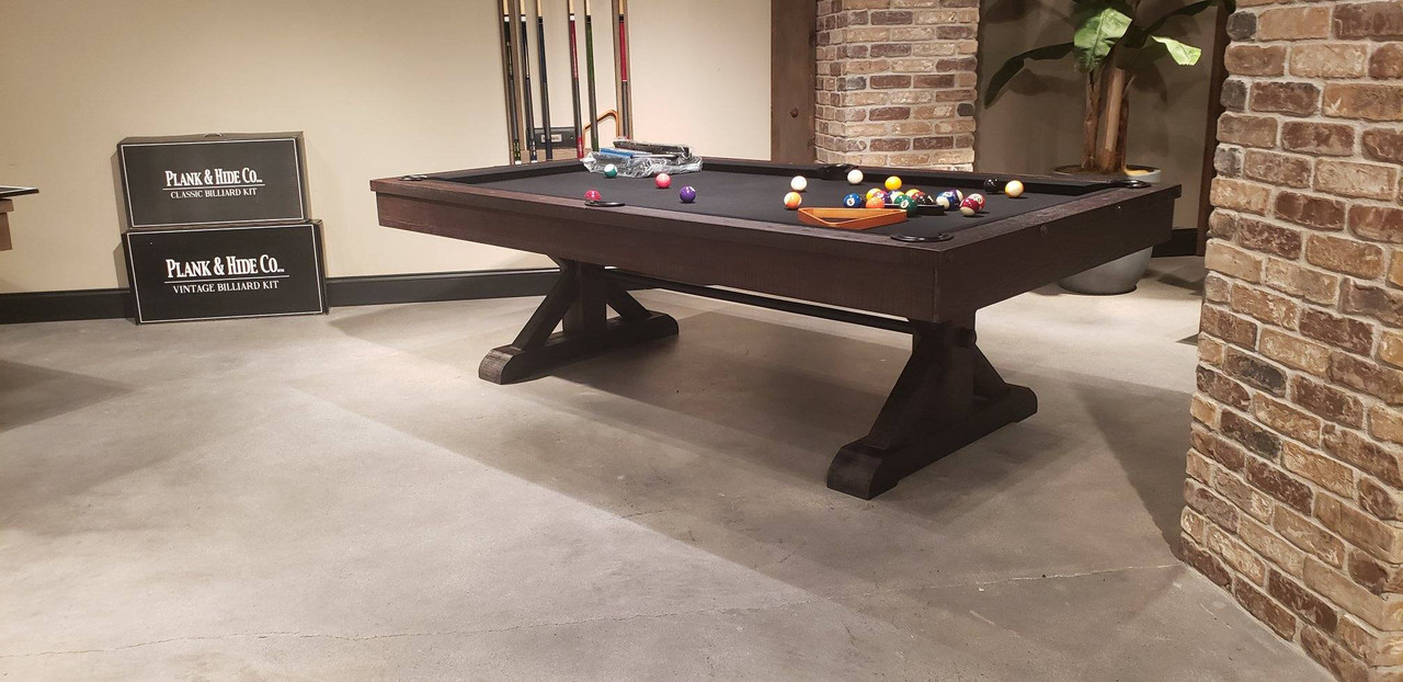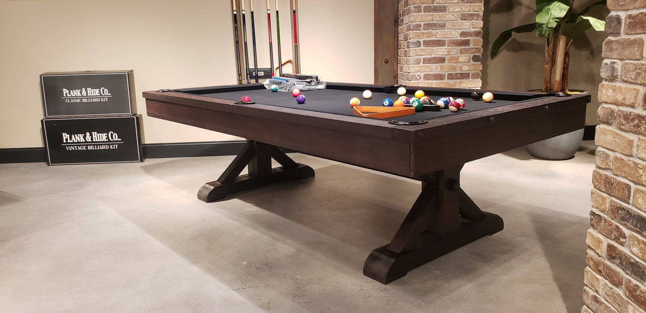 - Includes the Plank & Hide Classic Billiards Accessory Kit: (4) cue sticks, billiard balls, triangle, bridge stick, chalk, and table brush