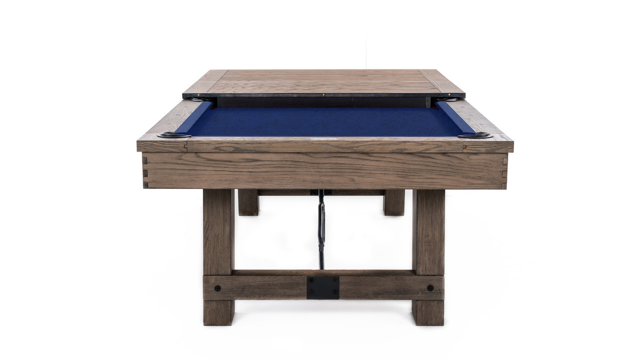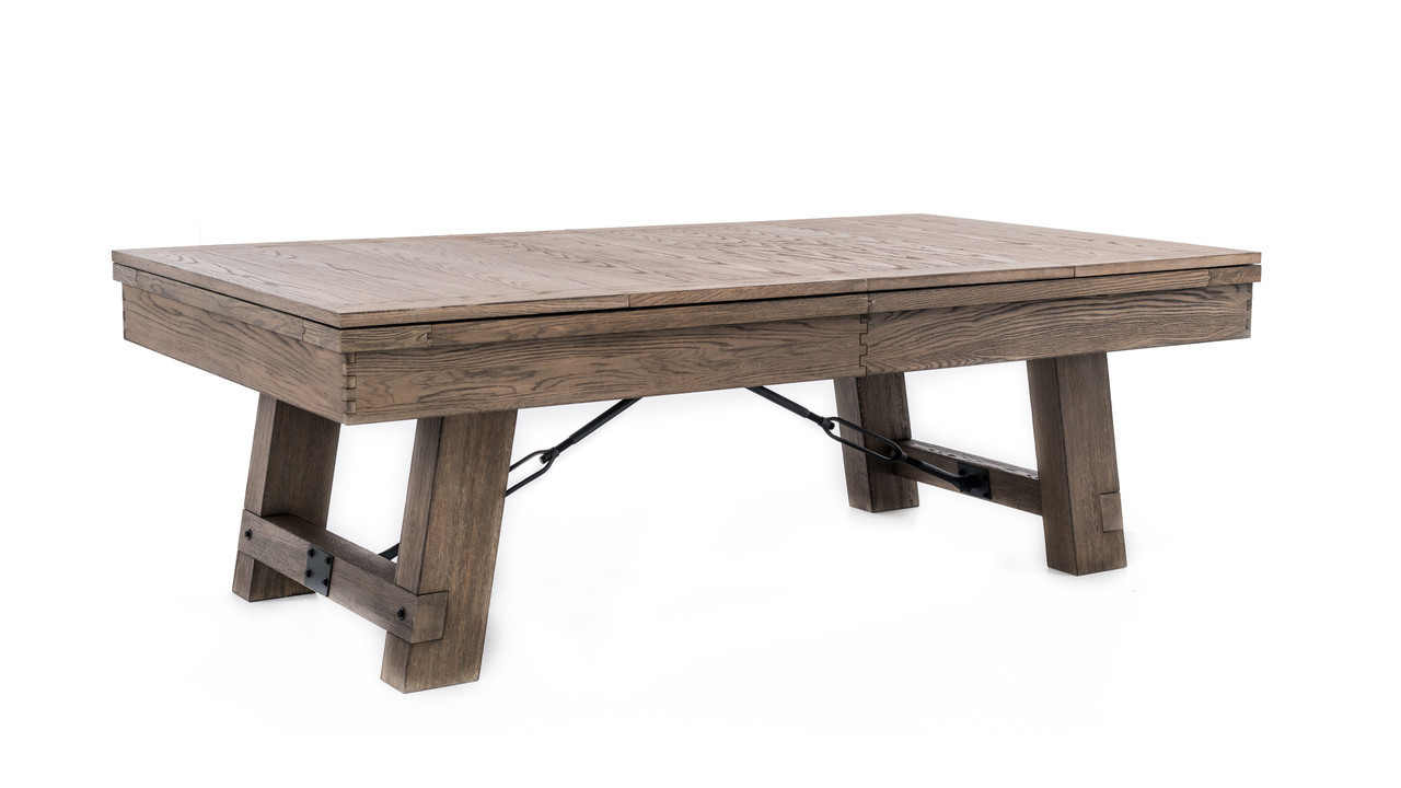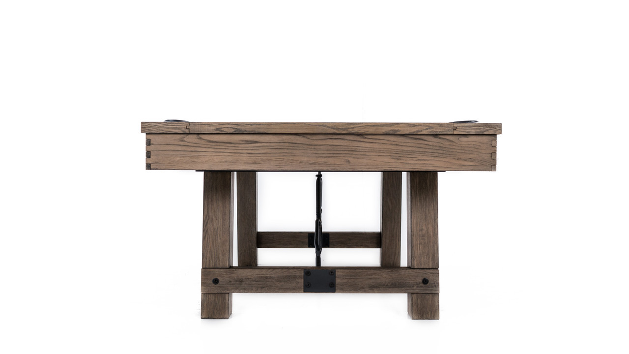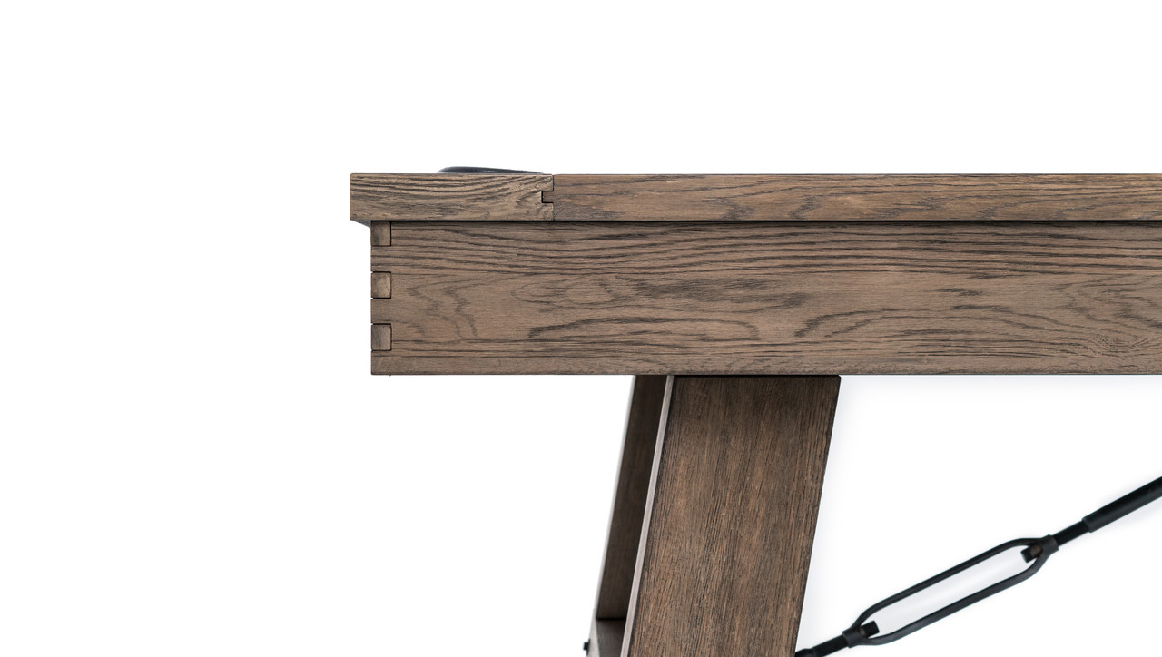 The Isaac Slate Pool Table by Plank & Hide is a bold blend of architectural form and modern industrial styling—offered exclusively at Sawyer Twain, the leading source for luxury game room furniture across the USA. Available in both 7ft and 8ft sizes, the Isaac’s exclusive Silvered Ash finish reveals a subtle mix of sand-washed wood grain and light silver accents, making it an ideal showpiece for transitional, rustic, or contemporary interiors. Its oversized finger-jointed rails and aprons, brushed black turnbuckles, and tapered legs that flare outward deliver a strong, grounded silhouette built for both performance and presence. Precision-embedded diamond pearl sights enhance gameplay, while genuine leather drop pockets maintain a clean-lined finish. Want to entertain? The optional four-piece dining conversion top transforms your Isaac into a multifunctional masterpiece—perfect for open-concept living or hospitality spaces. Customize it with your choice of upgraded Championship Invitational Teflon felt—spill-resistant, vibrant, and built to last. And with complimentary true white-glove installation in your room of choice, Sawyer Twain ensures a luxury experience from purchase to play.