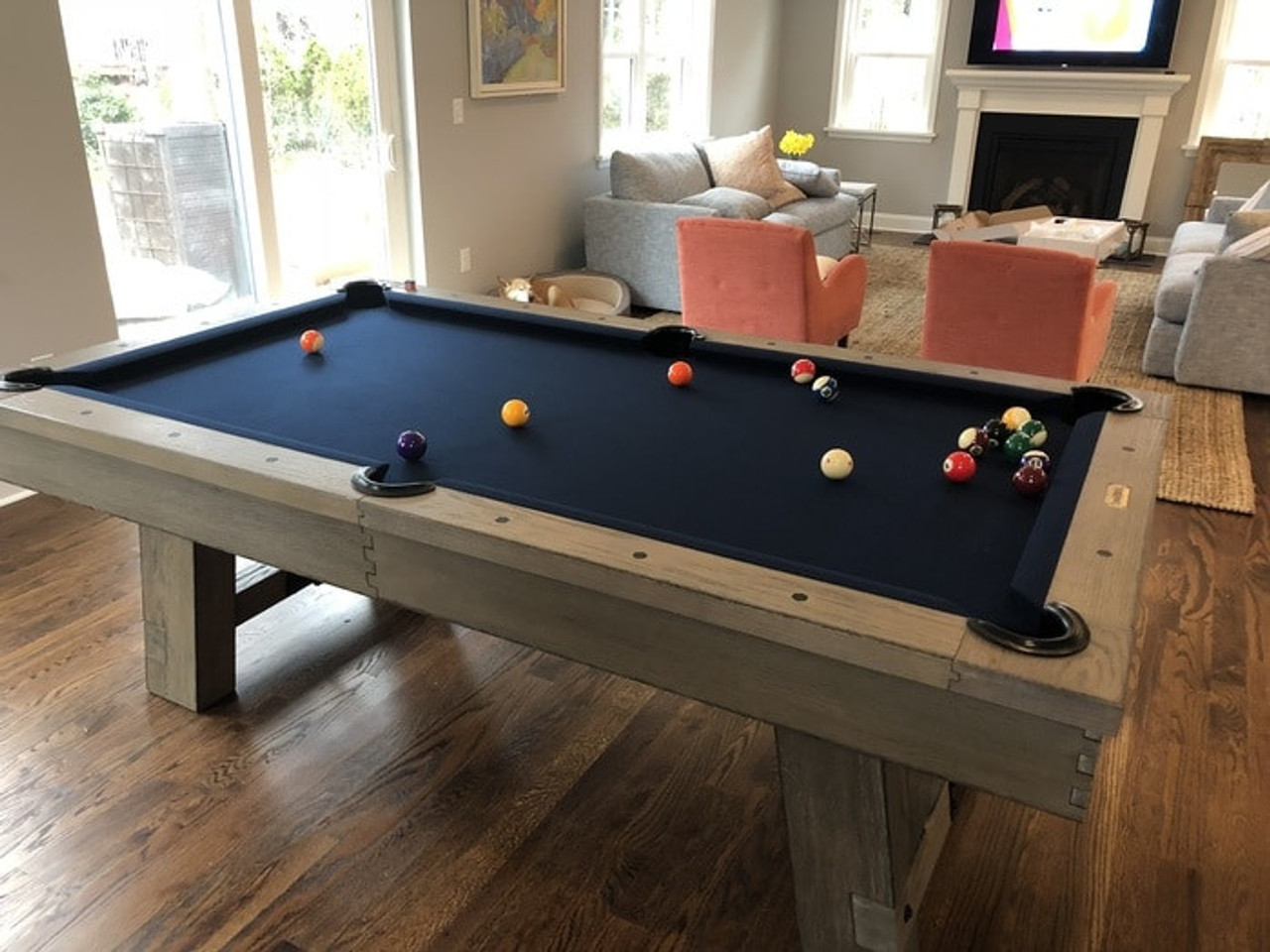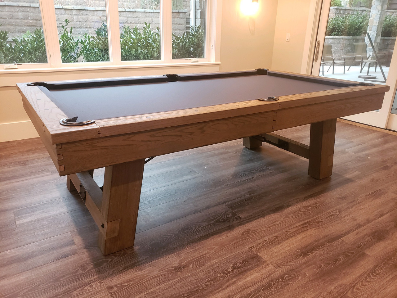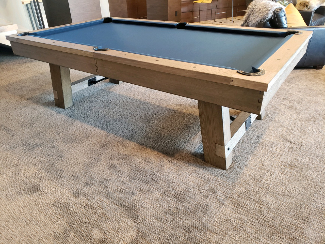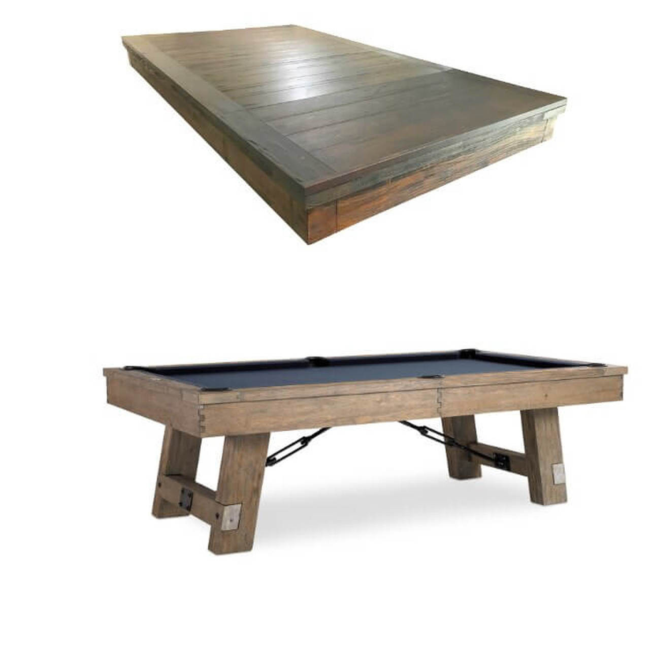 The Isaac Slate Pool Table by Plank & Hide is a bold blend of architectural form and modern industrial styling—offered exclusively at Sawyer Twain, the leading source for luxury game room furniture across the USA. Available in both 7ft and 8ft sizes, the Isaac’s exclusive Silvered Ash finish reveals a subtle mix of sand-washed wood grain and light silver accents, making it an ideal showpiece for transitional, rustic, or contemporary interiors. Its oversized finger-jointed rails and aprons, brushed black turnbuckles, and tapered legs that flare outward deliver a strong, grounded silhouette built for both performance and presence. Precision-embedded diamond pearl sights enhance gameplay, while genuine leather drop pockets maintain a clean-lined finish. Want to entertain? The optional four-piece dining conversion top transforms your Isaac into a multifunctional masterpiece—perfect for open-concept living or hospitality spaces. Customize it with your choice of upgraded Championship Invitational Teflon felt—spill-resistant, vibrant, and built to last. And with complimentary true white-glove installation in your room of choice, Sawyer Twain ensures a luxury experience from purchase to play.