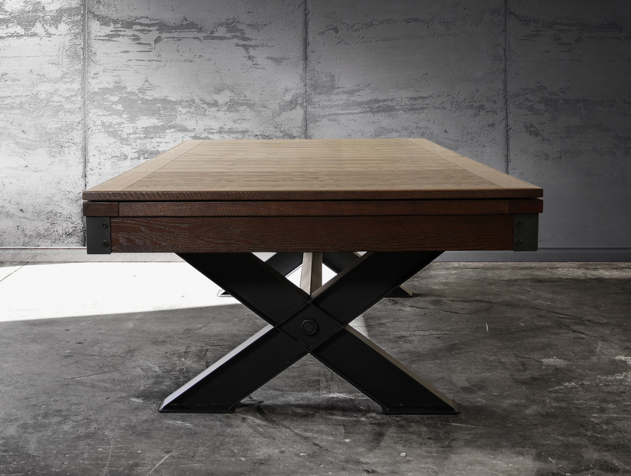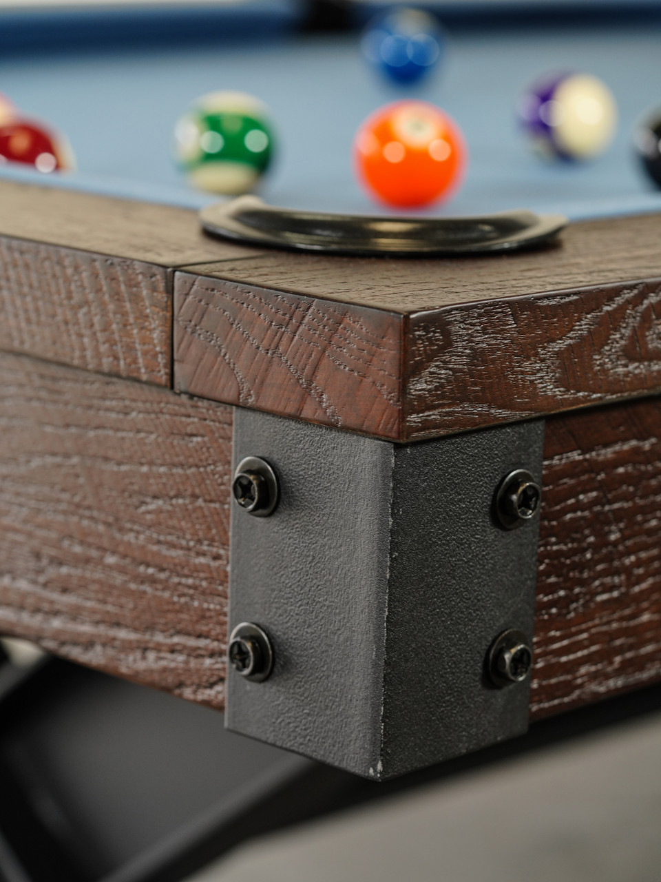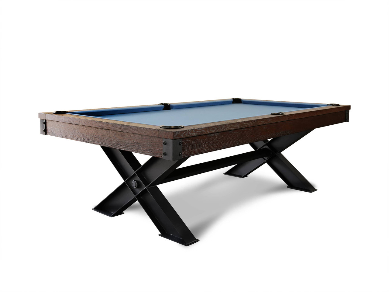 The Portland Slate Pool Table by Nixon Billiards combines modern architectural design with rustic warmth. Featuring a solid hardwood cradle in a rich, natural finish and bold industrial X-style legs in matte black steel, this 8' pool table delivers serious presence in any game room, loft, or entertainment space. It's more than a game table—it's a design-forward centerpiece built for real play.